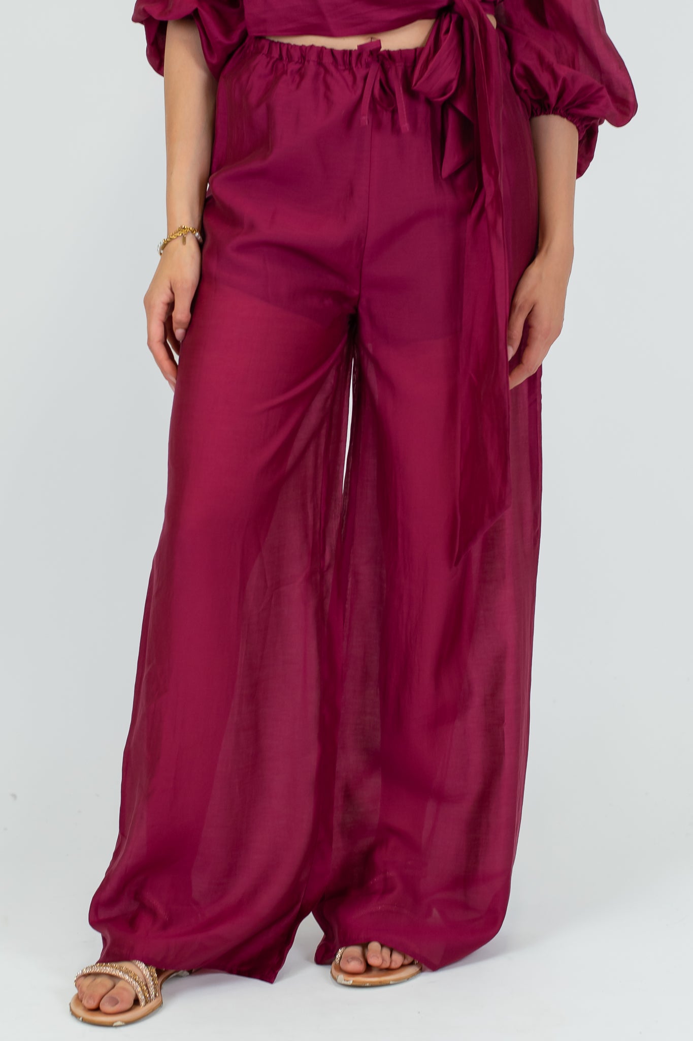 Tensione in - Pantalone palazzo con ricami in pizzo sangallo e coulisse