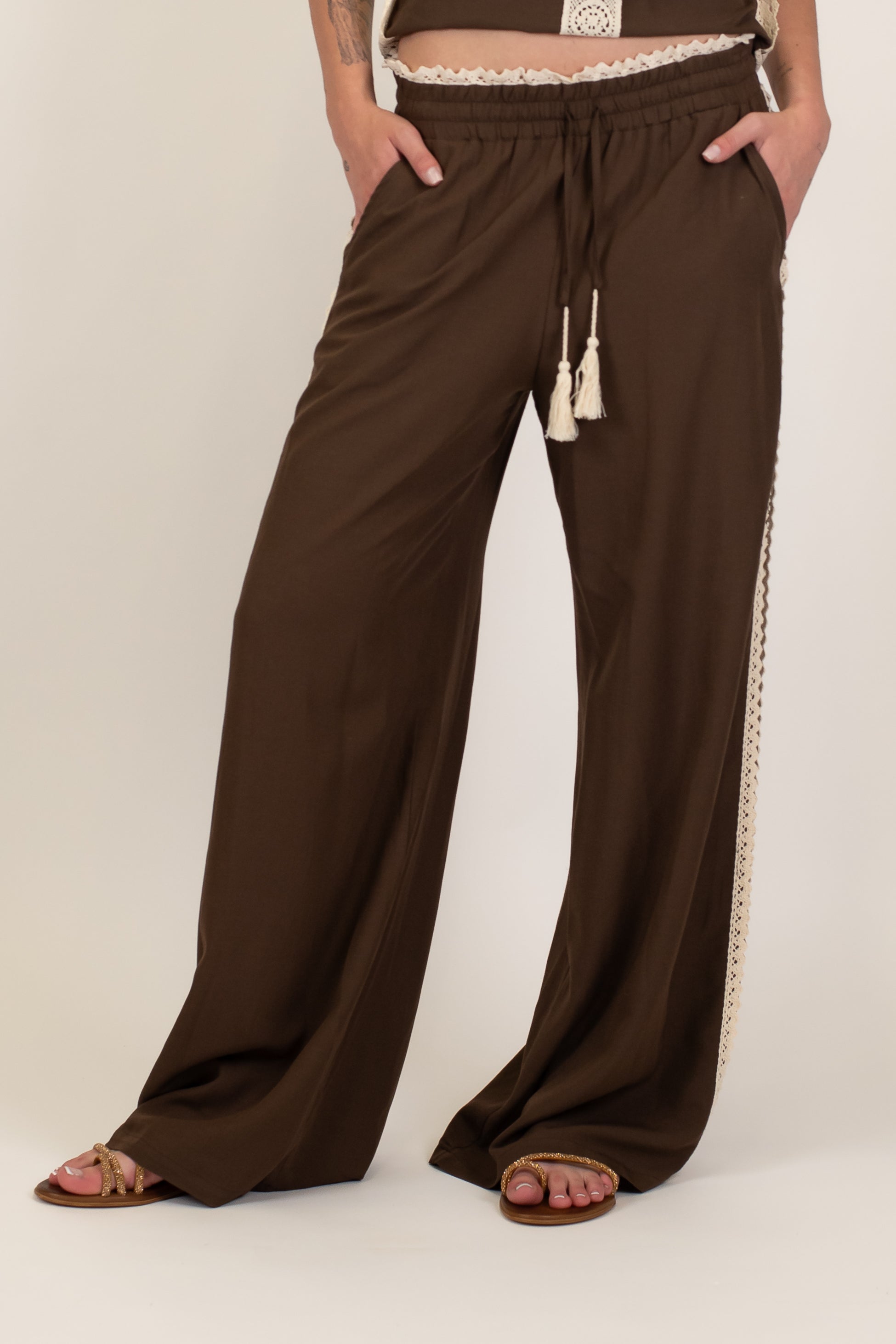 Haveone - Pantalone palazzo con ricami in pizzo sangallo e coulisse