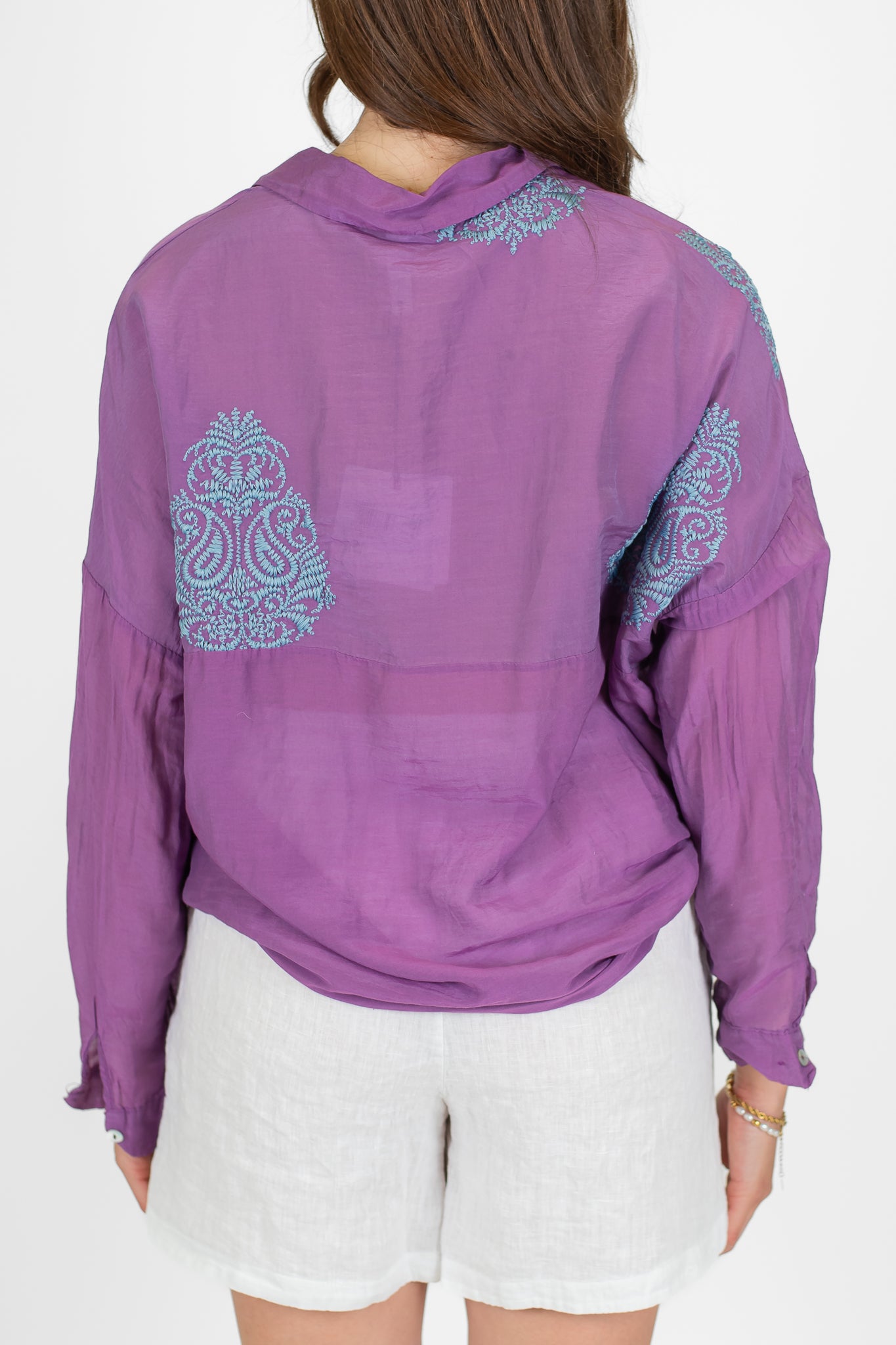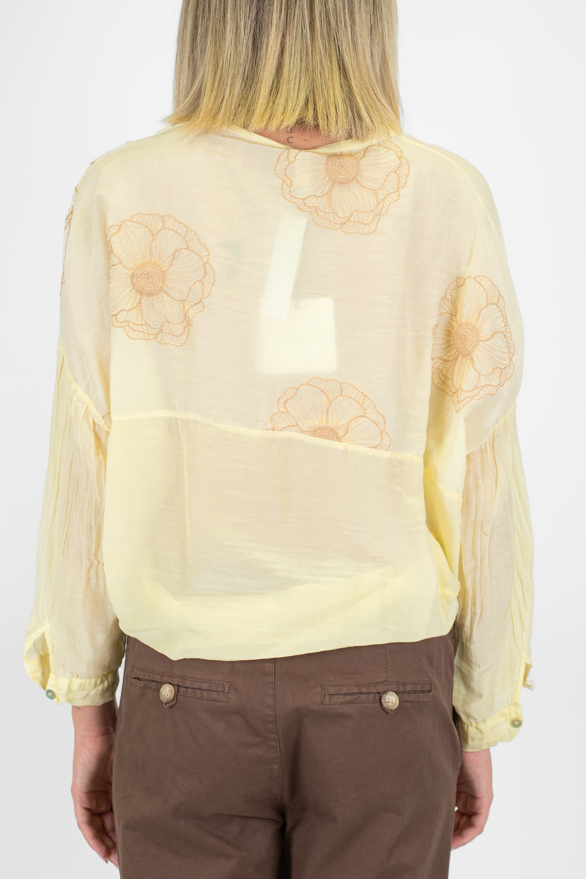Tensione in - Camicia in misto seta con ricami a contrasto e collo coreano