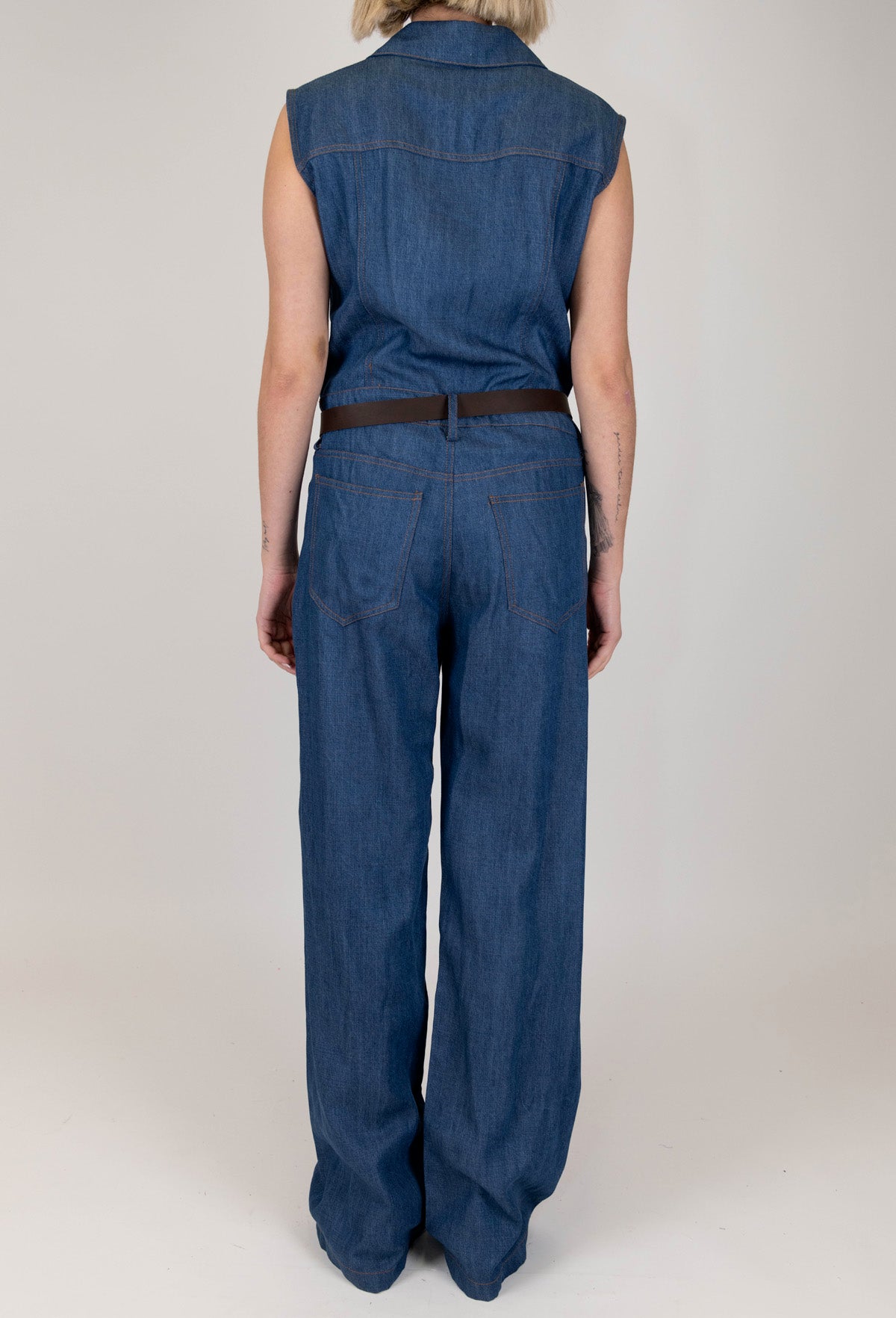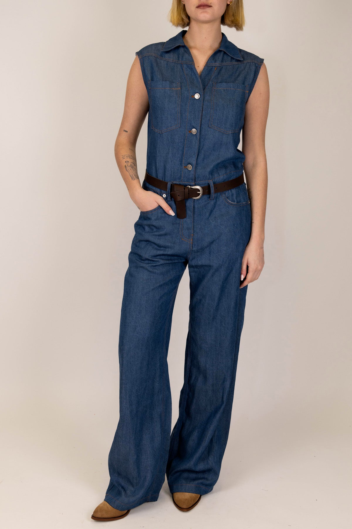 Tensione in - Tuta giromaniche in denim con pantalone palazzo
