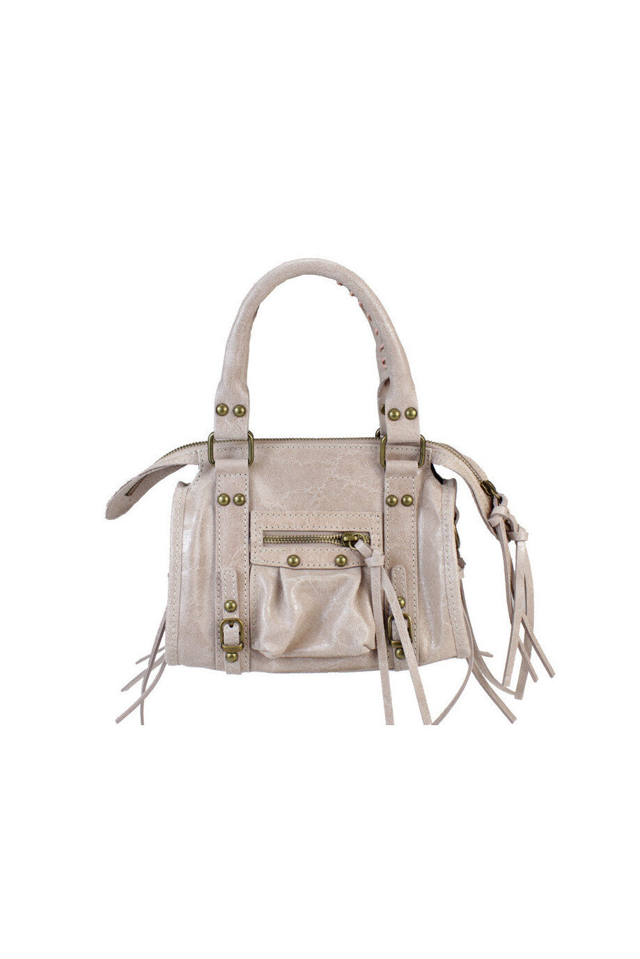 Borsa piccola in pelle 100% vera pelle made in italy spalmata con finiture in oro anticato, tasca esterna, chiusura a zip con lacci di pelle e tracolla. Altezza con manico: 33cm Altezza senza manico: 18cm Larghezza: 24cm Profondità: 6cm