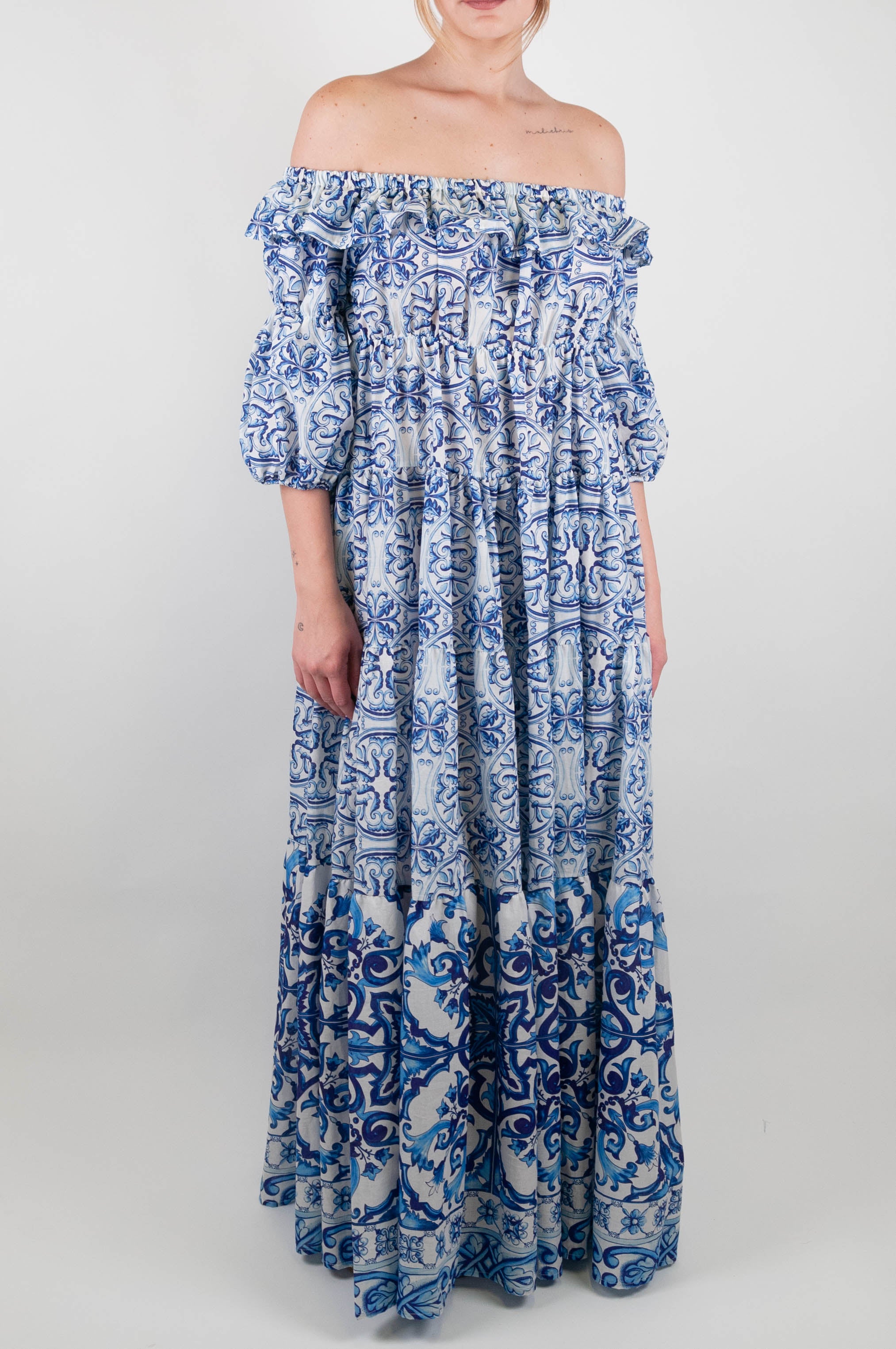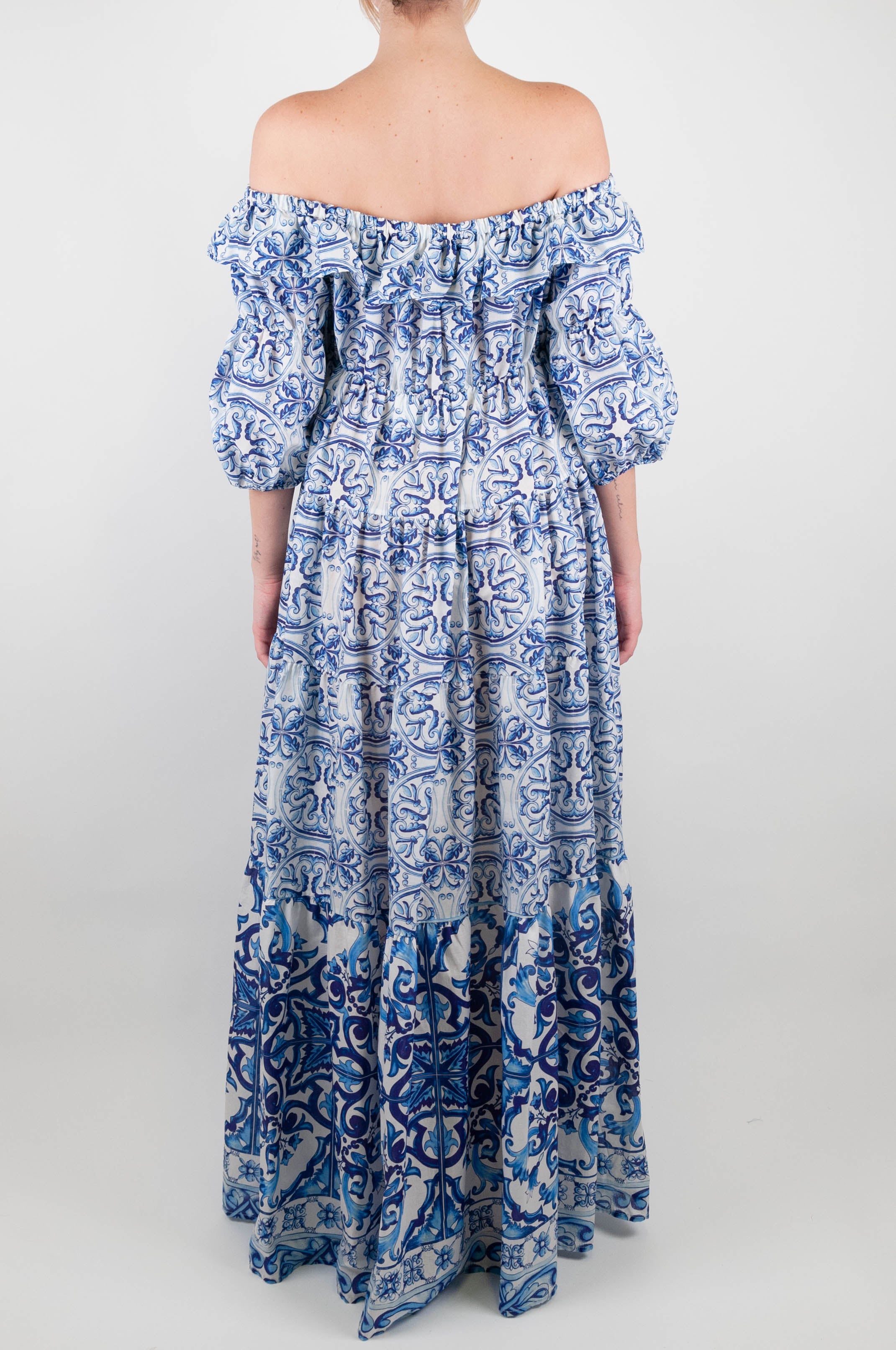 Abito lungo fantasia maioliche Dixie, con scollo shiffer, maniche tre quarti e balze. Composizione: 100%CO