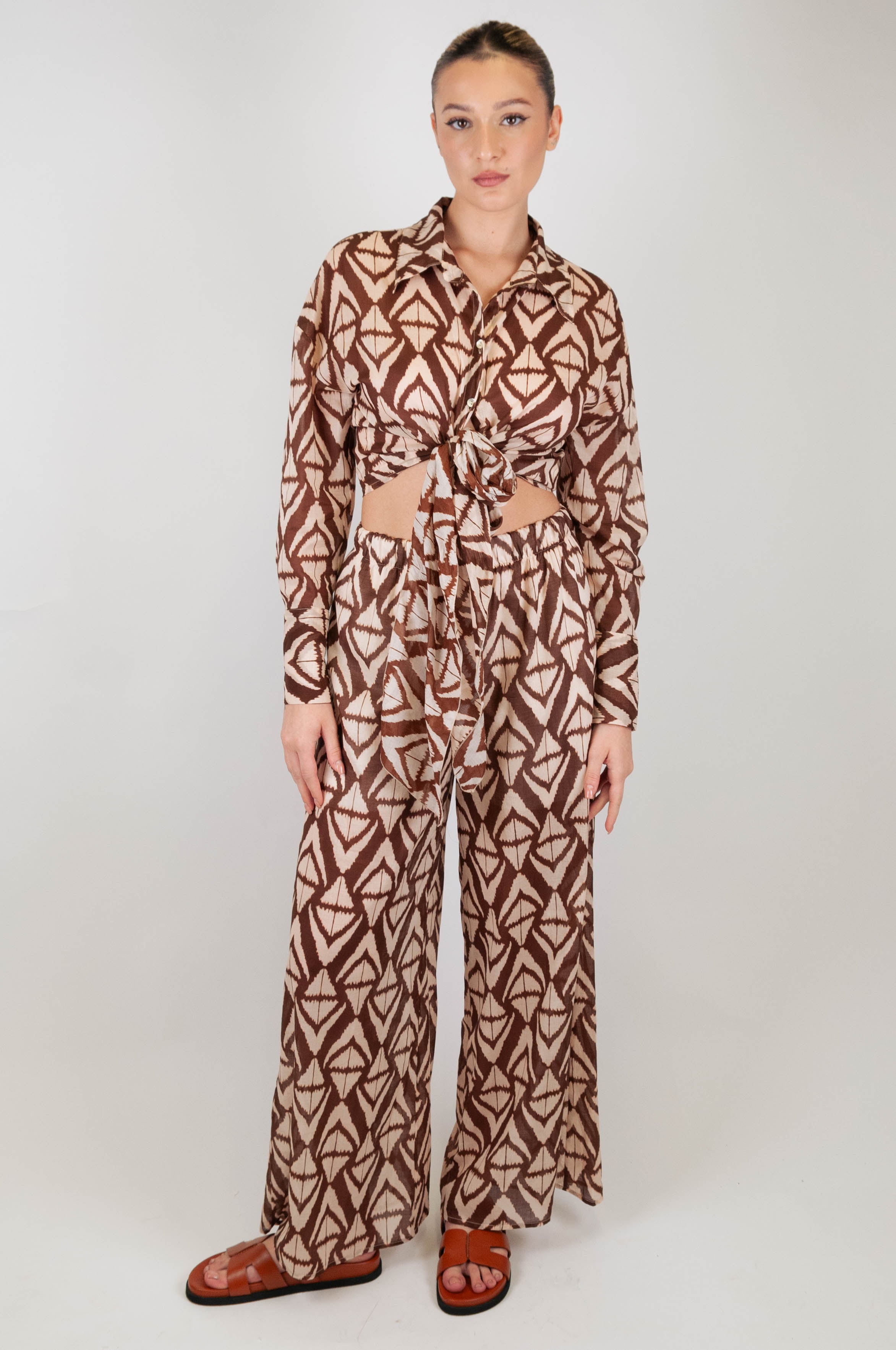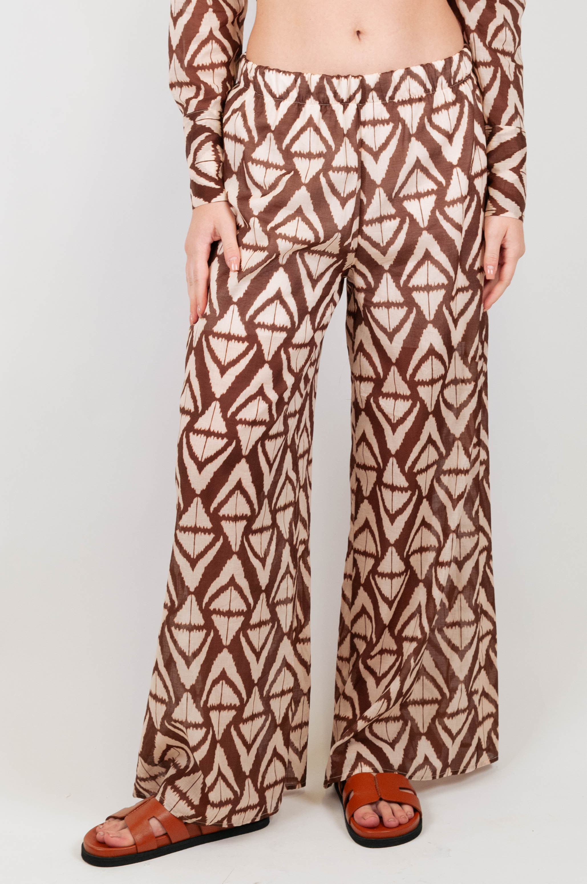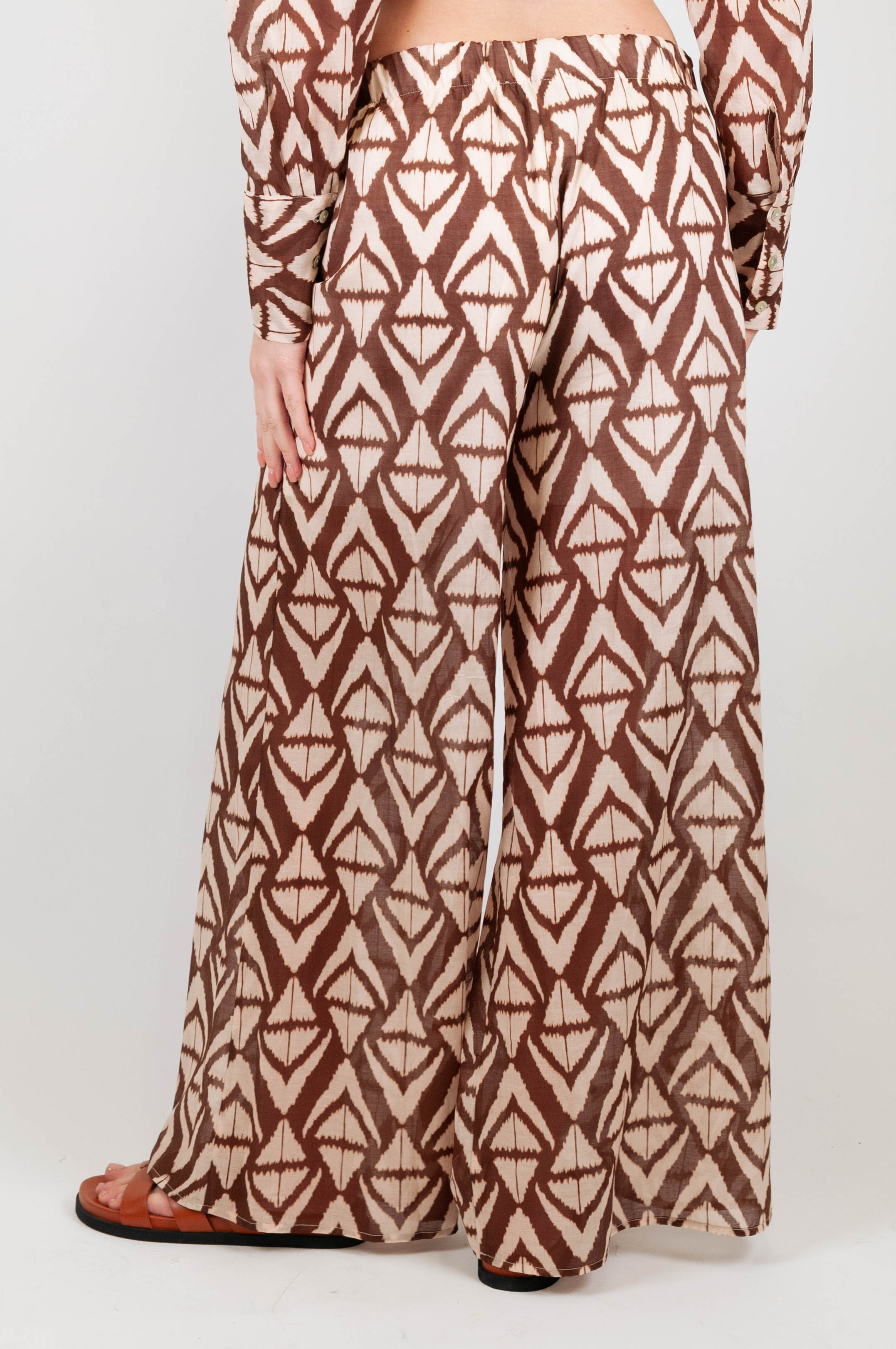 Pantalone palazzo fantasia astratta in mussola di cotone Haveone, con elastico in vita. Composizione: 100%CO