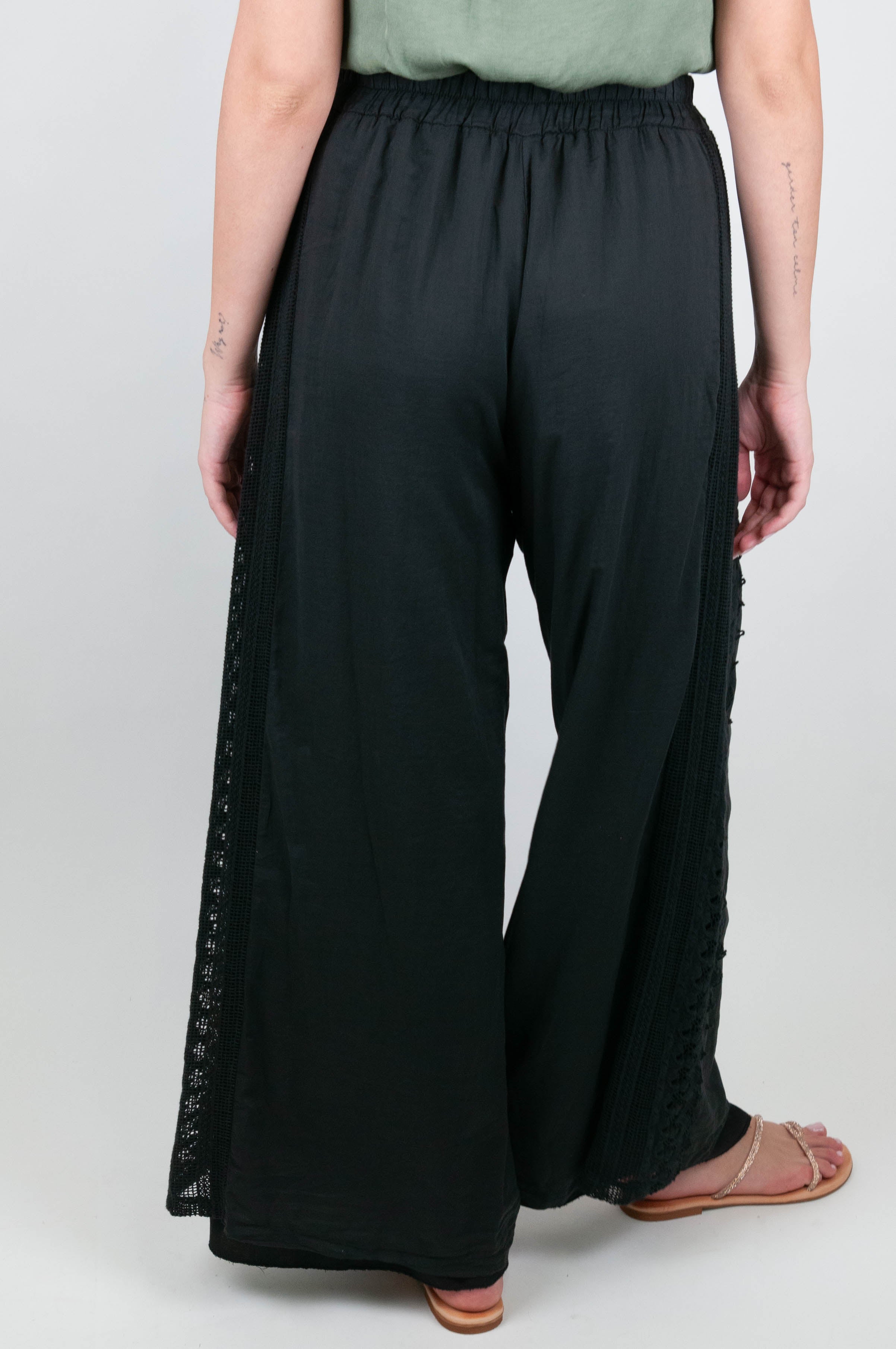 Haveone - Pantalone palazzo in mussola di cotone con banda laterale in pizzo ed elastico in vita