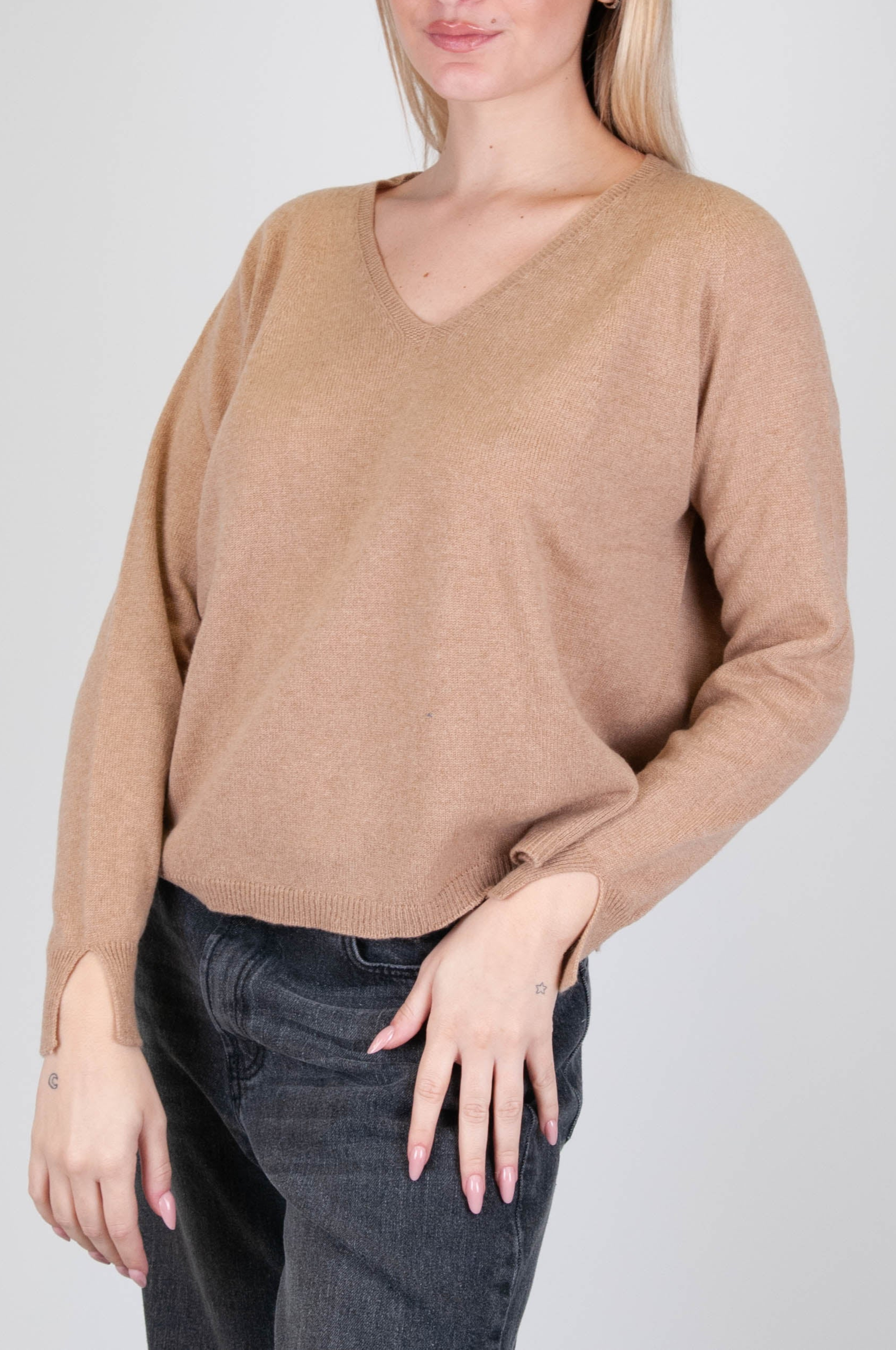 Motel - Maglia con scollo a V 100% in puro cashmere con spacchetti sui polsi