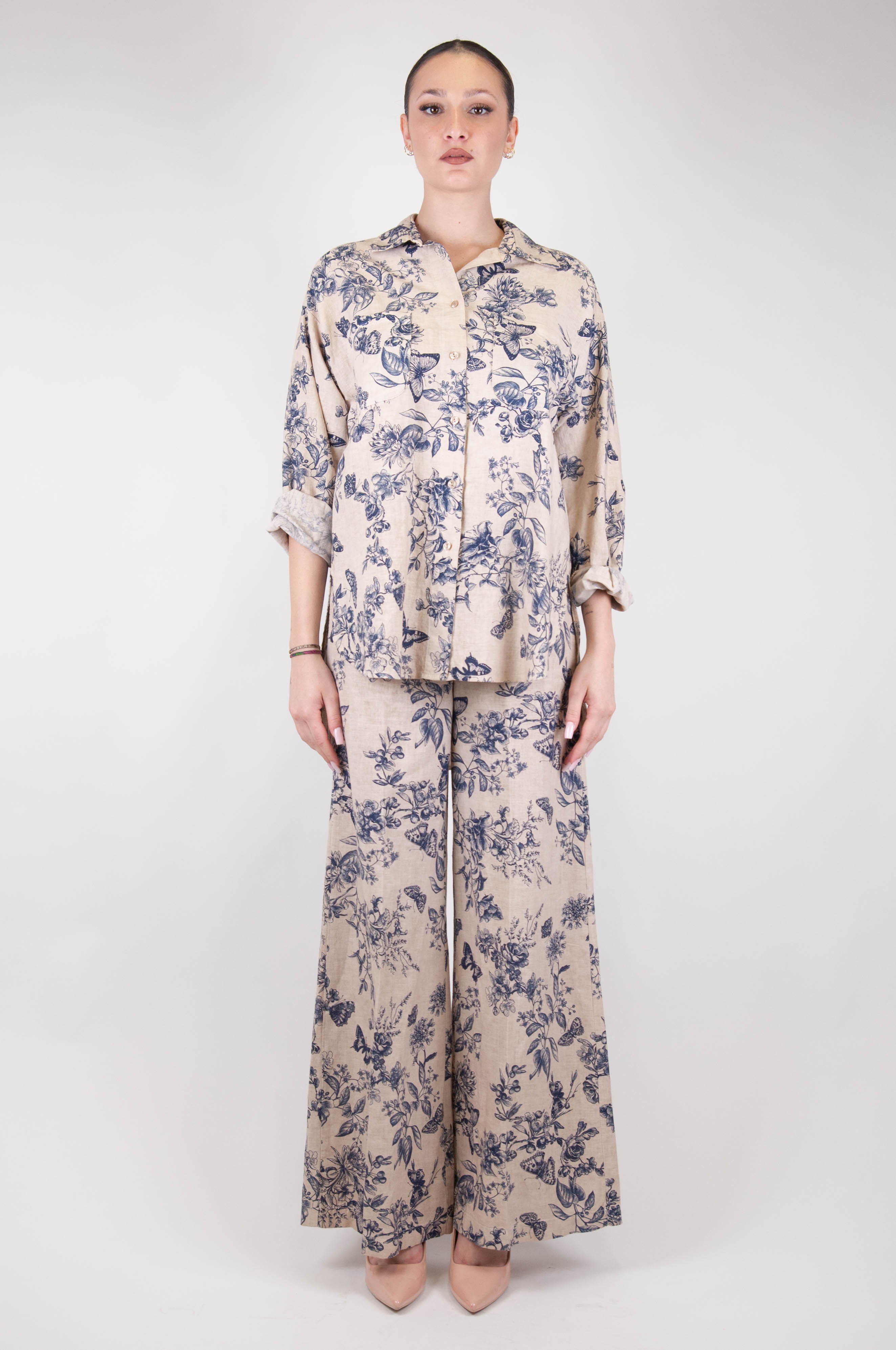 Motel - Pantalone palazzo in misto lino fantasia floreale con elastico sul retro
